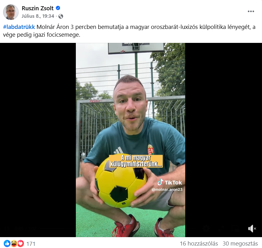 Ruszintól nem áll távol, hogy az ellenzéket segítse: Facebookján évek óta tesz közzé kormányellenes tartalmakat, a Tisza előtt a régi baloldali politikusok bejegyzéseit is megosztotta. Feltűnő, hogy unokatestvére, Ruszin-Szendi Romulusz mellett rendszeresen kiteszi Molnár Áron "noÁr" anyagait is, gyakorlatilag csak kettőjüktől közöl politikai videókat. Ahogy több cikkünkben is foglalkoztunk vele, NoÁr tagja annak a Bajnai Gordonhoz köthető társaságnak, ahonnan elindult a Tisza.10