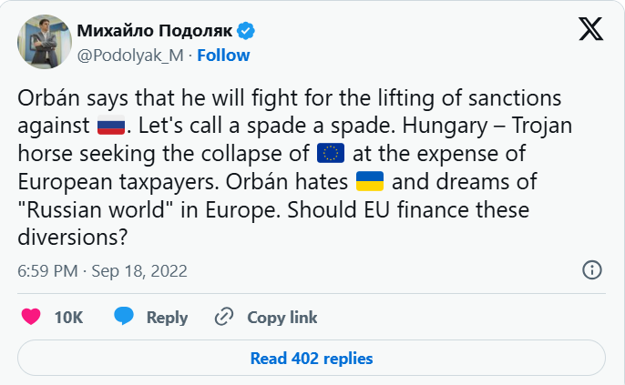 2022 - Mihajlo Podoljak: Magyarország az EU összeomlására játszó "trójai faló"24