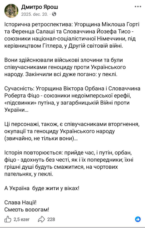 "Történelmi visszatekintés: Horthy Miklós és Szálasi Ferenc Magyarországa, valamint Jozef Tiso Szlovákiája a nemzetiszocialista Németország szövetségesei voltak Hitler vezetése alatt a második világháborúban. Háborús bűnöket követtek el, és bűnrészesek voltak az ukrán nép elleni népirtásban. Mindannyian nagyon rosszul végezték: a pokolban.