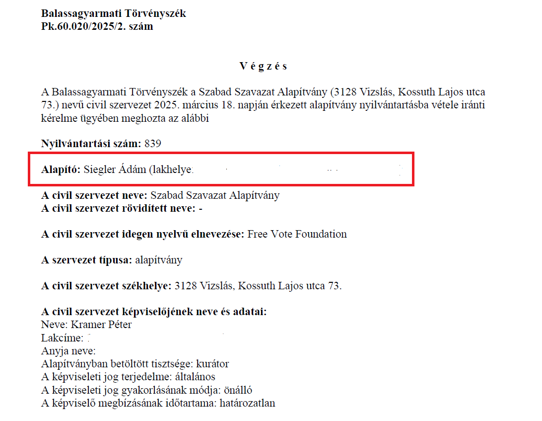 A bírósági papírok alapján Siegler Ádám volt az alapító, és Kramer mellett Siegler is aktív tevékenységet fejt ki az új háttérszervezetben.