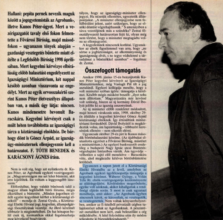 Így feljelentették az Agrobank vezetőit, Kunos Pétert és Kovács Mihályt, akiket 1994 novemberében a rendőrök előzetes letartóztatásba helyezték. Sokat elmond a botrány volumenéről, hogy a televízióban élőben közvetítették a rendőrségi akciót. Így milliók nézték, ahogy a bankvezetőket hátrabilincselt kézzel elvezették.4