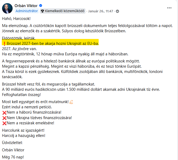 Persze, könnyen ellenőrizhető, hogy ez az állítás hazugság, hiszen - ahogy arra Orbán Viktor is emlékeztett a 2026-os évindító nemzetközi sajtótájékoztatóján - a Tisza Párt szimpatizánsai úgy szavaztak, hogy Ukrajnát fel kell venni az unióba.